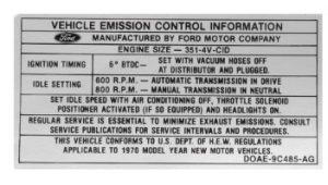 Emission Decal Auto/Manual 351 4V 70